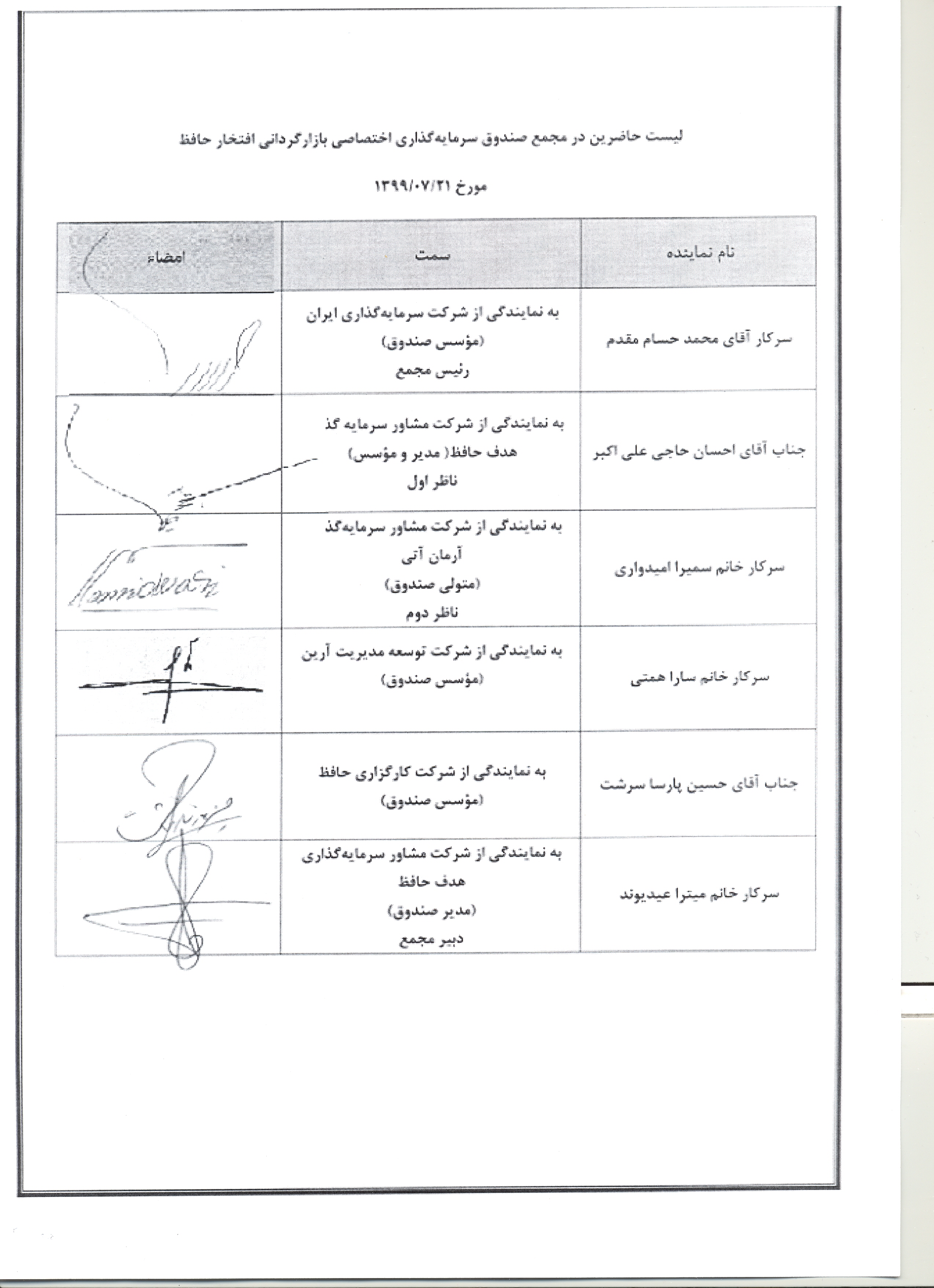 لیست حاضرین در مجمع صندوق مشترک افتخار حافظ مورخ۹۶/۱۰/۱۹